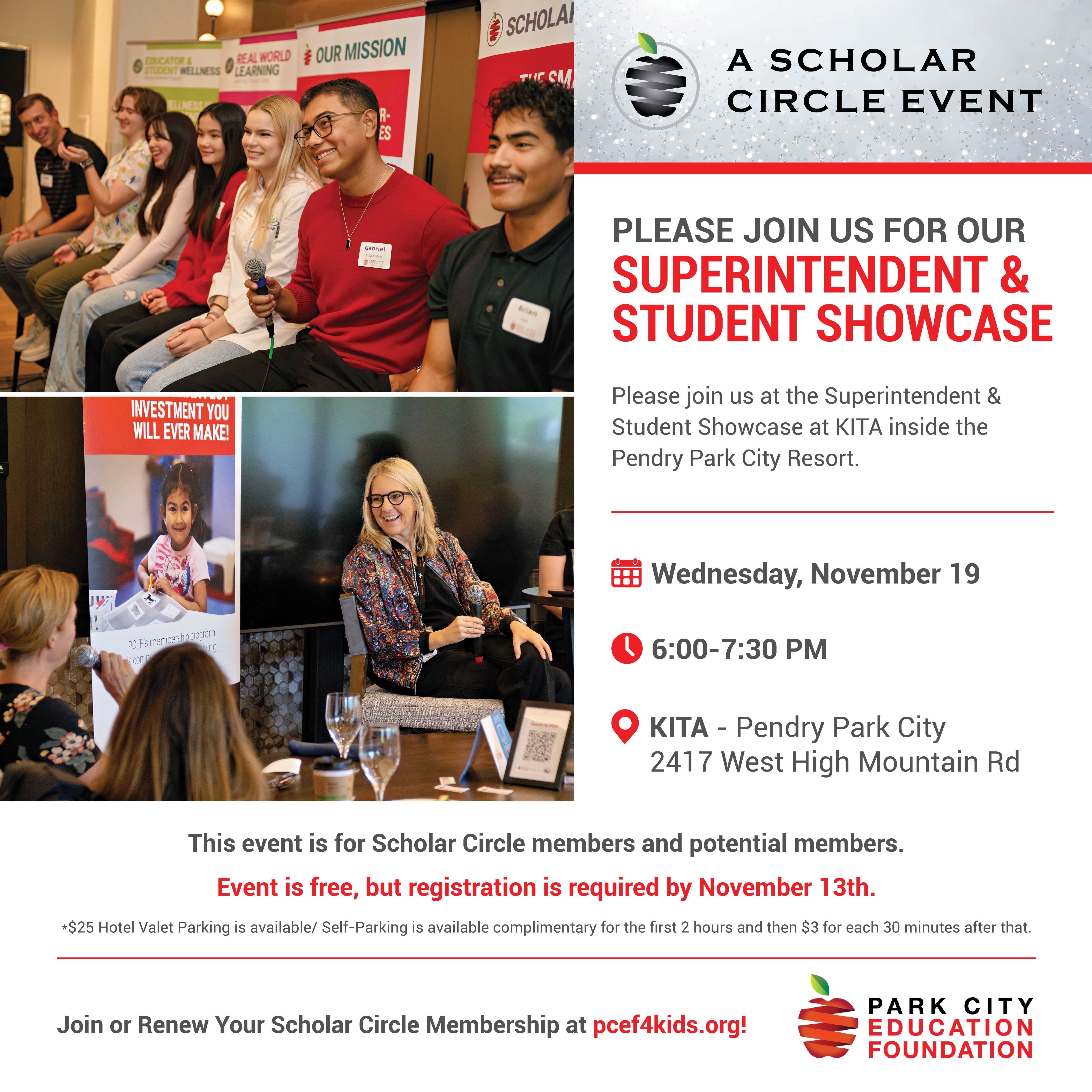 Please join us for our Superintendent and Student Showcase and panel discussion at the Pendry Park City. This event is for our Scholar Circle members and potential members. Event if free, but registration is required by November 13th.