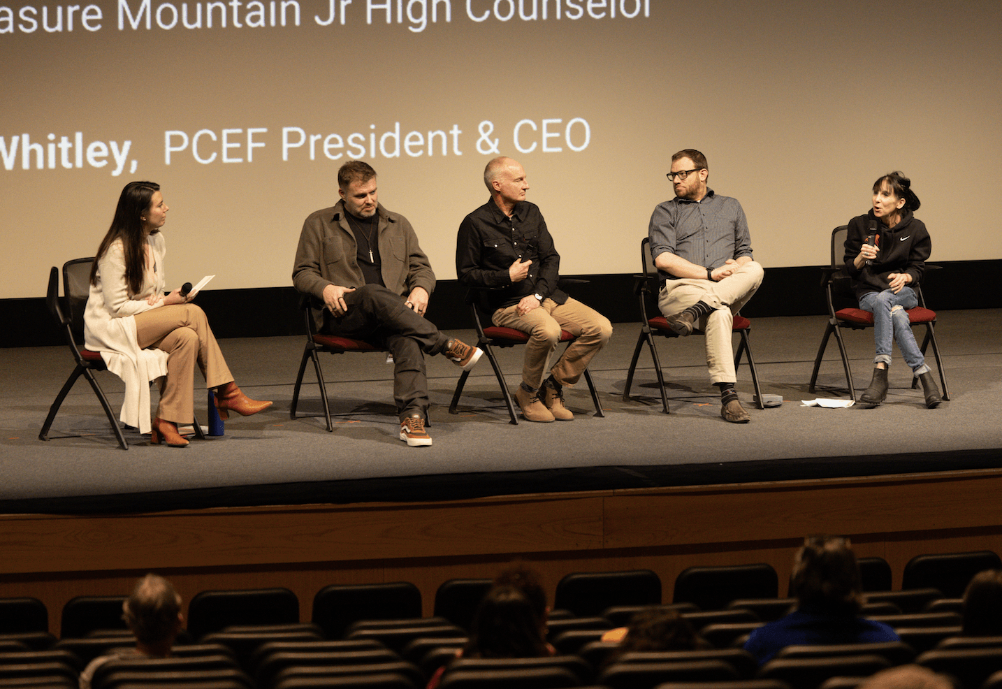 Photo (from left): PCEF President & CEO Ingrid Whitley, Niko Jensen PCHS Counselor, PCSD Wellness Coordinator Jed Thomas, PCHS Assistant Principal Ben Mueller, & Prevention Coordinator Larissa Fomuke – Panelists at the 2025 screening of Screenagers, presented by PCEF.