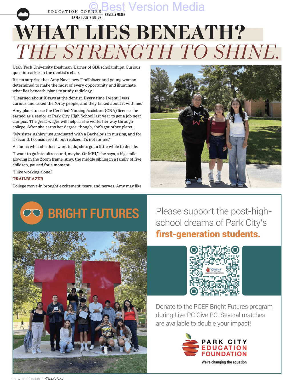 “They’re pushy about good grades, and I’m glad. I became a good test taker and have a good memory. My parents are immigrants—they came here to provide me with a better future. I want to do my very best for them.” Looking ahead, Amy wants to get involved on campus, just as she was in high school. She doesn’t expect her radiology studies to end anytime soon. “I want to specialize and explore—to find something I like. I see myself working, traveling, and eventually returning to Park City. That’s where my family is.”