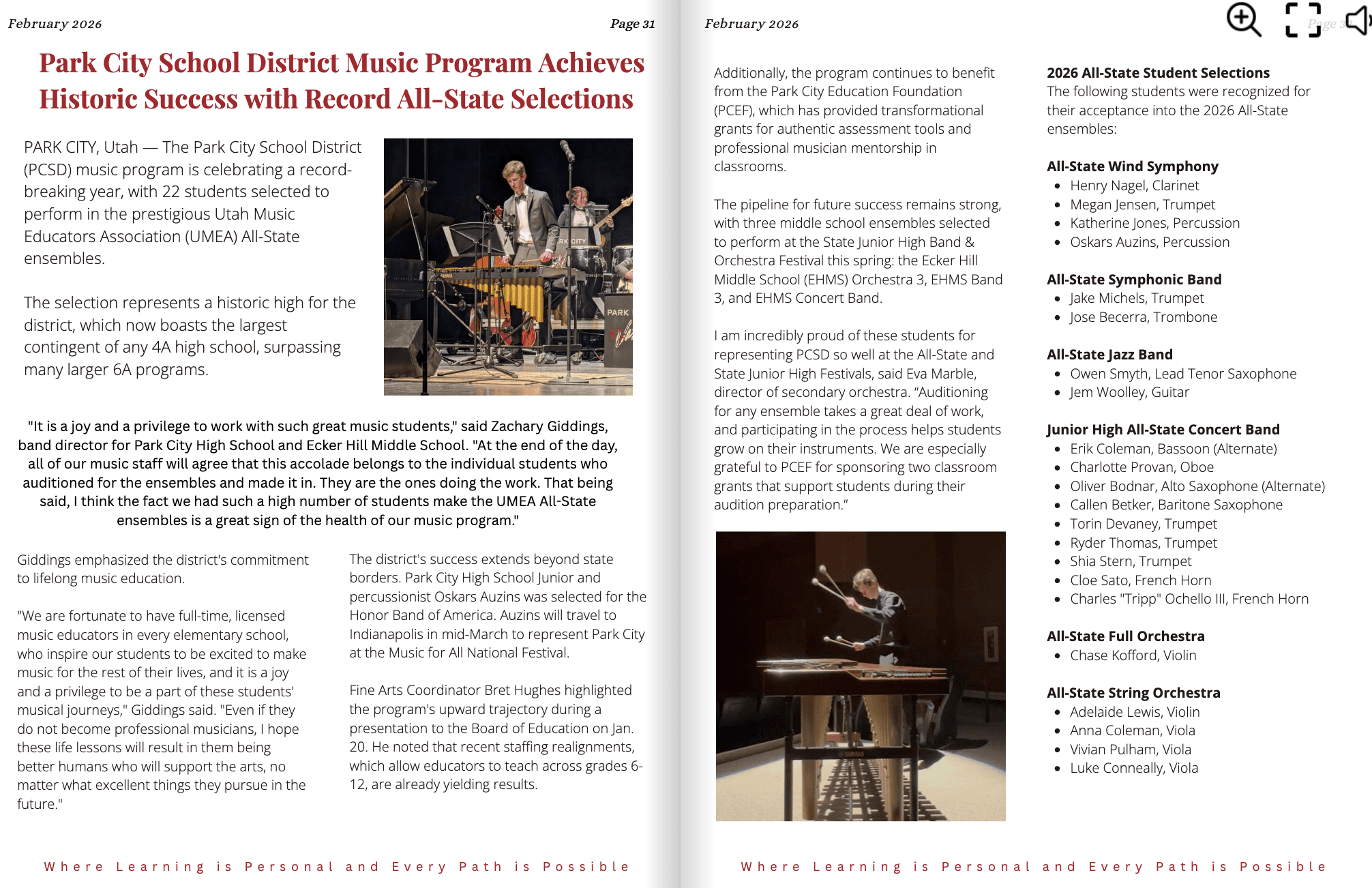 The district’s success extends beyond state borders. Park City High School junior and percussionist Oskars Auzins was selected for the Honor Band of America. Auzins will travel to Indianapolis in mid-March to represent Park City at the Music for All National Festival.